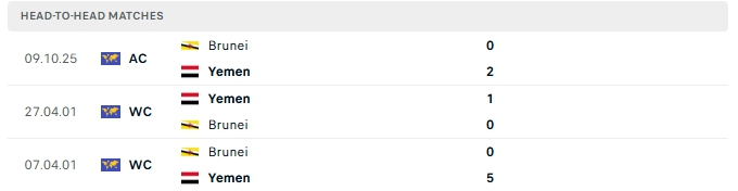 Những lần đụng độ giữa Yemen và Brunei thường diễn ra chặt chẻ và ít bàn thắng được tạo ra, cụ thể trong 2/3 lần gặp nhau gần nhất khép lại không quá 2 bàn thắng, lần gặp nhau gần nhất cũng chỉ có 2 bàn thắng được tạo ra.